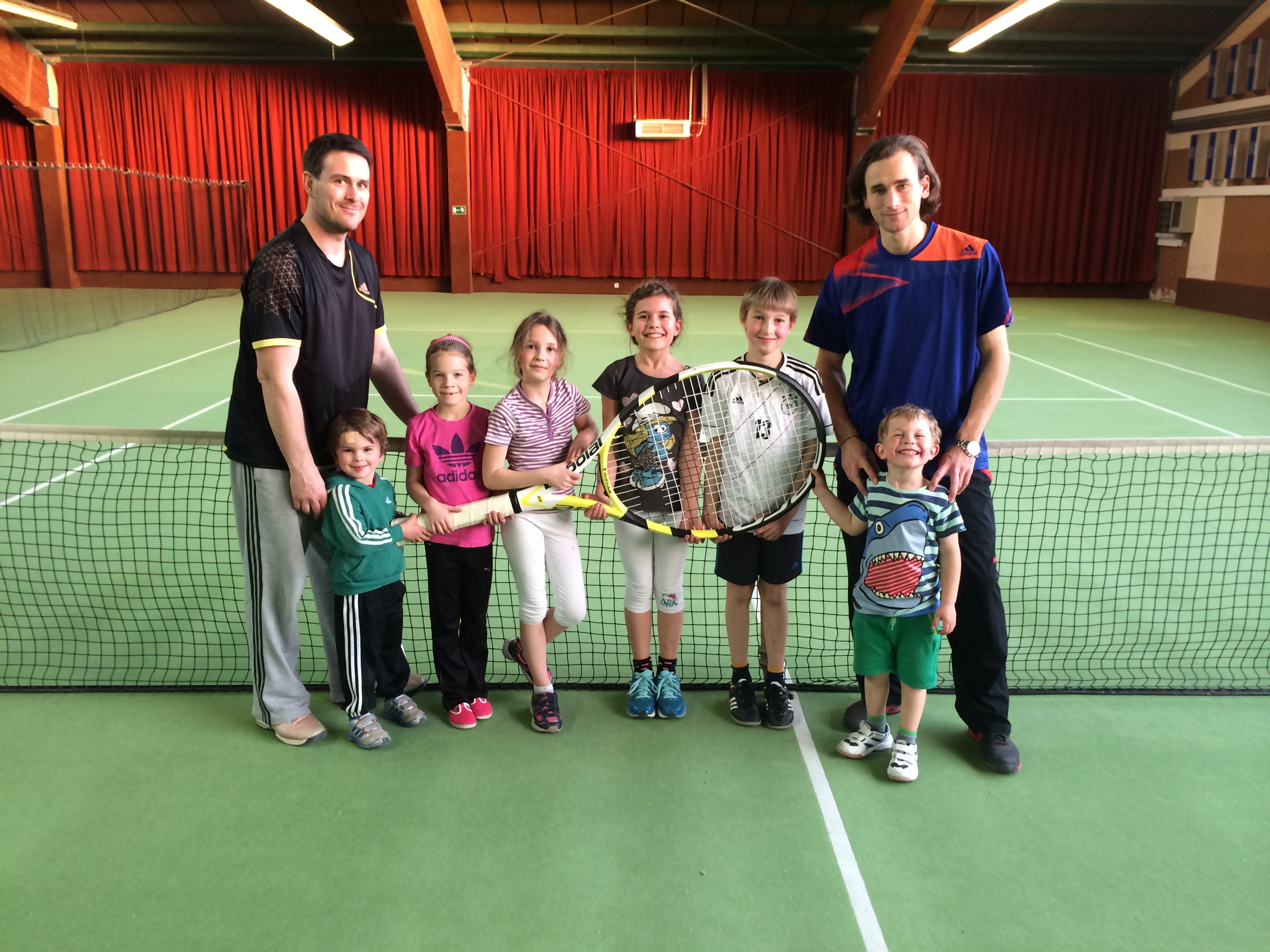 Das Foto zeigt Nikolai Khablo (rechts) und Matthias Bögl (links) von der Tennisschule mit einem Teil der am Schnuppertraining teilnehmenden Kinder.