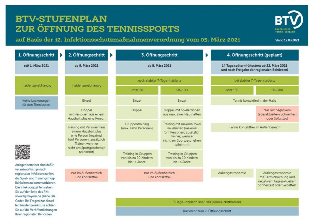 Die Tennisplätze im Außenbereich des TC 1974 Geiselhöring e.V. sind ab sofort geöffnet. Die mögliche Nutzung hängt vom jeweiligen regionalen Inzidenzwert ab und ist dem Aushang auf der Anlage sowie dem nachstehenden BTV-Stufenplan zu entnehmen. Inzidenzunabhängig sind Einzelspiele möglich, Doppel mit Personen aus einem Haushalt plus eine Person, Training mit Personen aus einem Haushalt plus eine Person (maximal fünf Personen; zusätzlich Trainer, wenn er nicht am Sportgeschehen teilnimmt). Ein Körperkontakt hat zu unterbleiben.