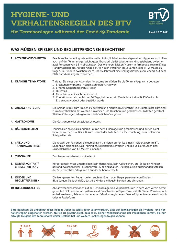 Duschen und Umkleideräume bleiben geschlossen, auf der Tennisanlage besteht, mit Ausnahme beim Spielbetrieb, Maskenpflicht. Die nachstehenden Hygiene- und Verhaltensregeln sind einzuhalten. Alle anwesenden Personen auf der Tennisanlage sind verpflichtet sich auf den Formblättern, die im Schaukasten aufliegen, zu registrieren.