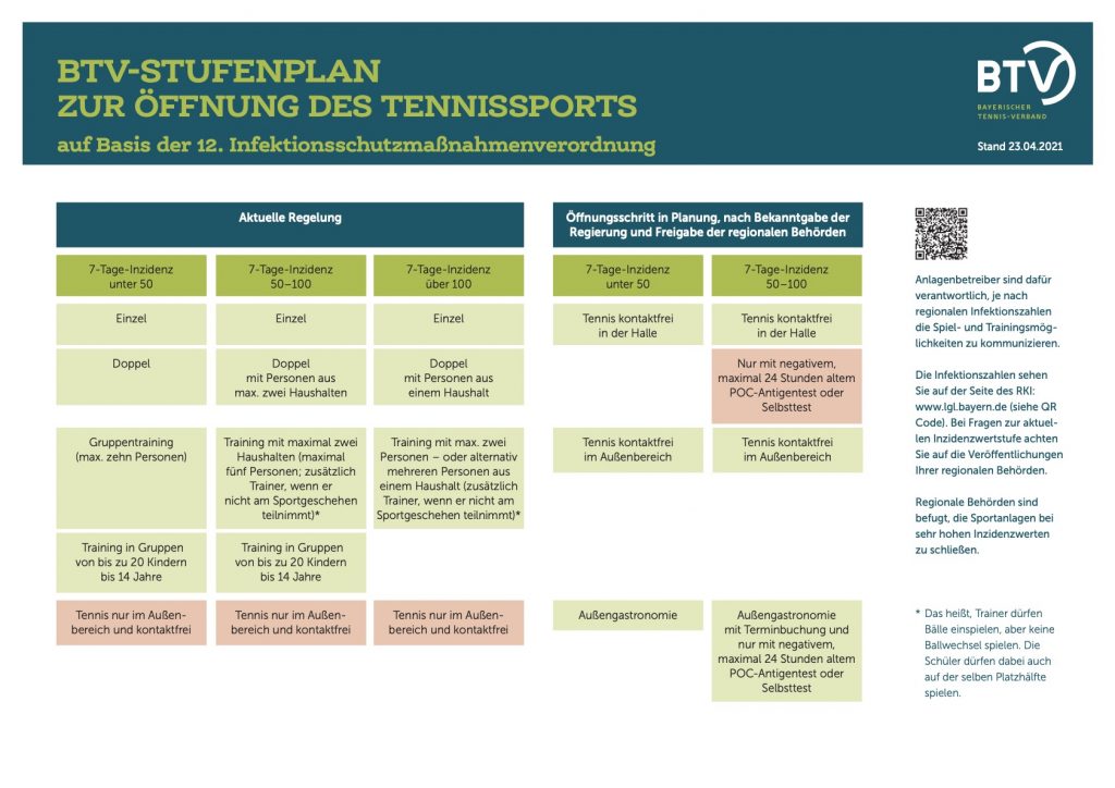 Allgemein Nutzung der Tennisplätze 24.04.2021 admin Die aktuell mögliche Nutzung der Tennisplätze ist dem nachstehenden BTV Stufenplan zu entnehmen. Wir bitten um entsprechende Beachtung.