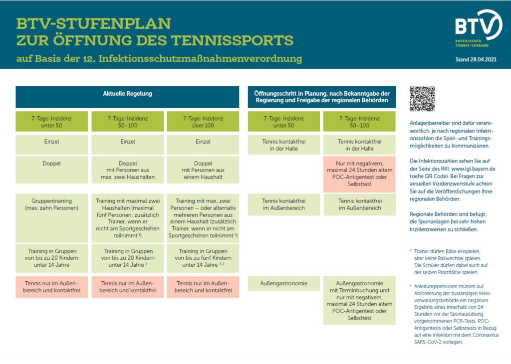 Allgemein Aktuelle Informationen zum Tennisbetrieb ab dem 28.04.2021 01.05.2021 admin In welcher Form Tennis und Tennistraining ausgeführt werden darf ist dem nachstehenden neuesten Stufenplan zu entnehmen. Wir bitten um Beachtung.