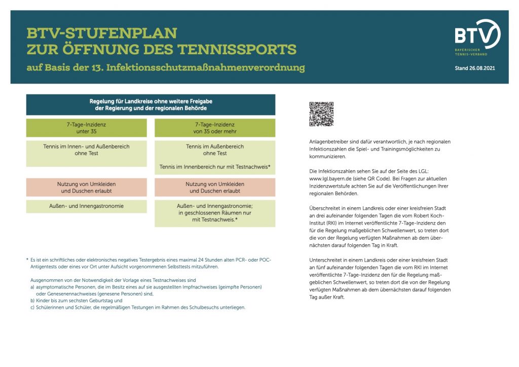 Die Bayerische Staatsregierung hat Änderungen der 13. Infektionschutzmaßnahmenverordnung beschlossen, die am 23. August 2021 in Kraft getreten sind. Diese Änderungen wirken sich auch auf den Tennissport aus, von größter Bedeutung ist der neue Inzidenz-Grenzwert von 35 für den Sport. Die entsprechenden Regelungen sind dem nachstehenden BTV- Stufenplan zu entnehmen. Die Vorstandschaft bittet um entsprechende Beachtung.