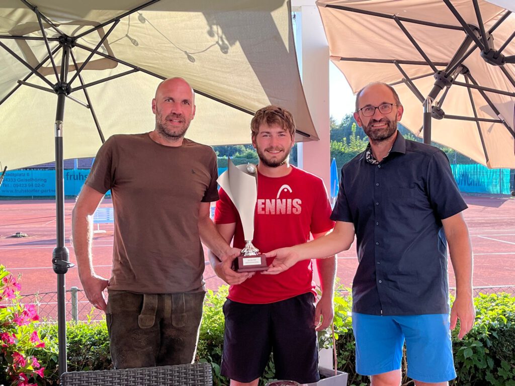 Stefan Singer, Turnierleiter und Vorstand des TC Geiselhöring, überreicht den Sepp Singer-Pokal an Lukas Erl und Christoph Wellenhofer (von rechts).